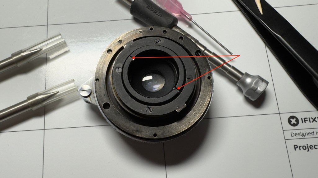 The inner ring holds the lens helicoid assembly to the lens block. Unscrew it with a lens spanner by engaging the two notches in the picture. Once it’s removed, the lens helicoid assembly will lift out and the lens block with the aperture will be all that’s left.