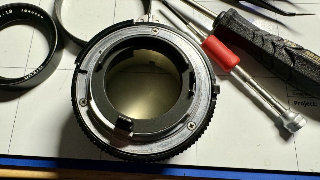 With the silver piece loosened, you can slide out the aperture adjustment ring. It’s possible to avoid having to move the knurled silver ring out of the way by removing the aperture coupling tab from the ring, but the screws are very small and delicate and Nikon used some kind of acentone-resistant glue. I didn’t want to strip the screws, so I just left them in place.