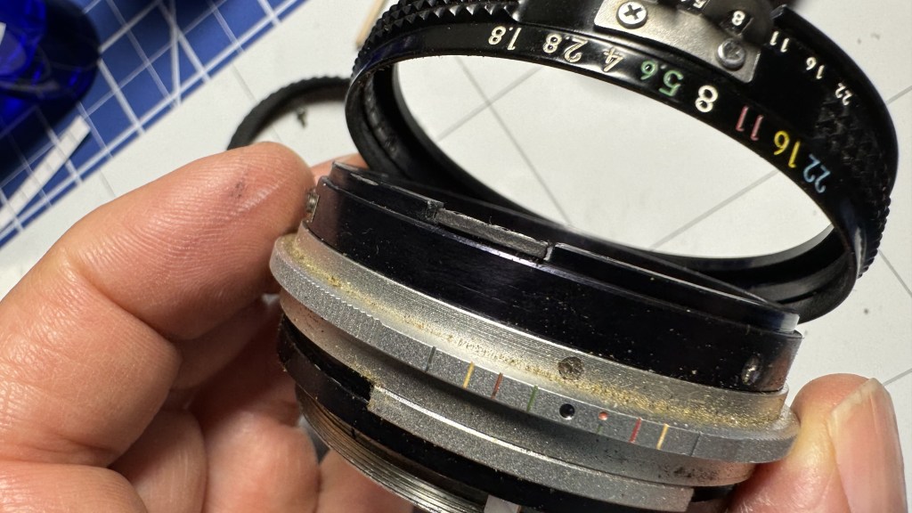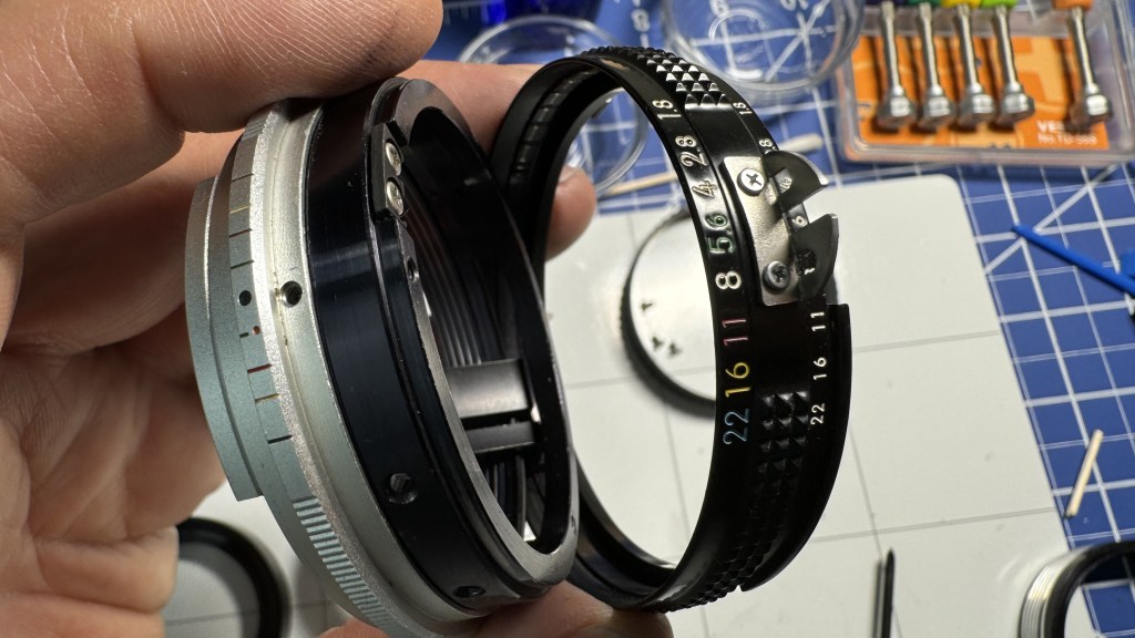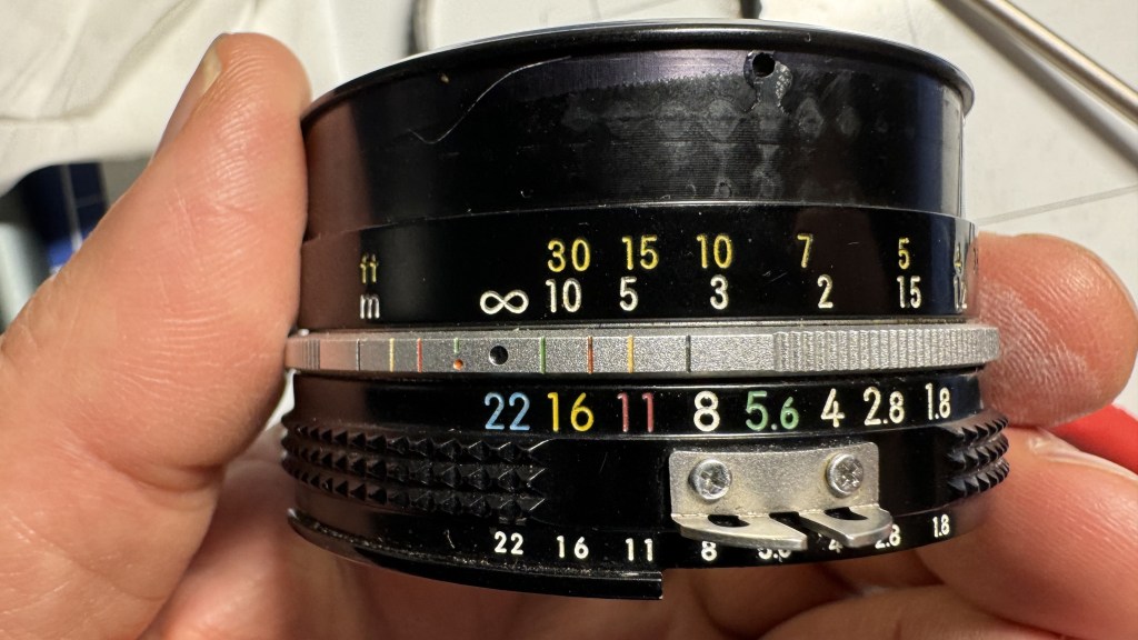 A general technique when working on manual focus lenses, turn the lens to infinity focus and the smallest aperture opening – for the Nikon 50mm f1.8 Ai lens, this is f22. This will help when re-assembling the lens. Also, be sure to take measurements before you totally disassemble major components so you can check your work when re-assembling.